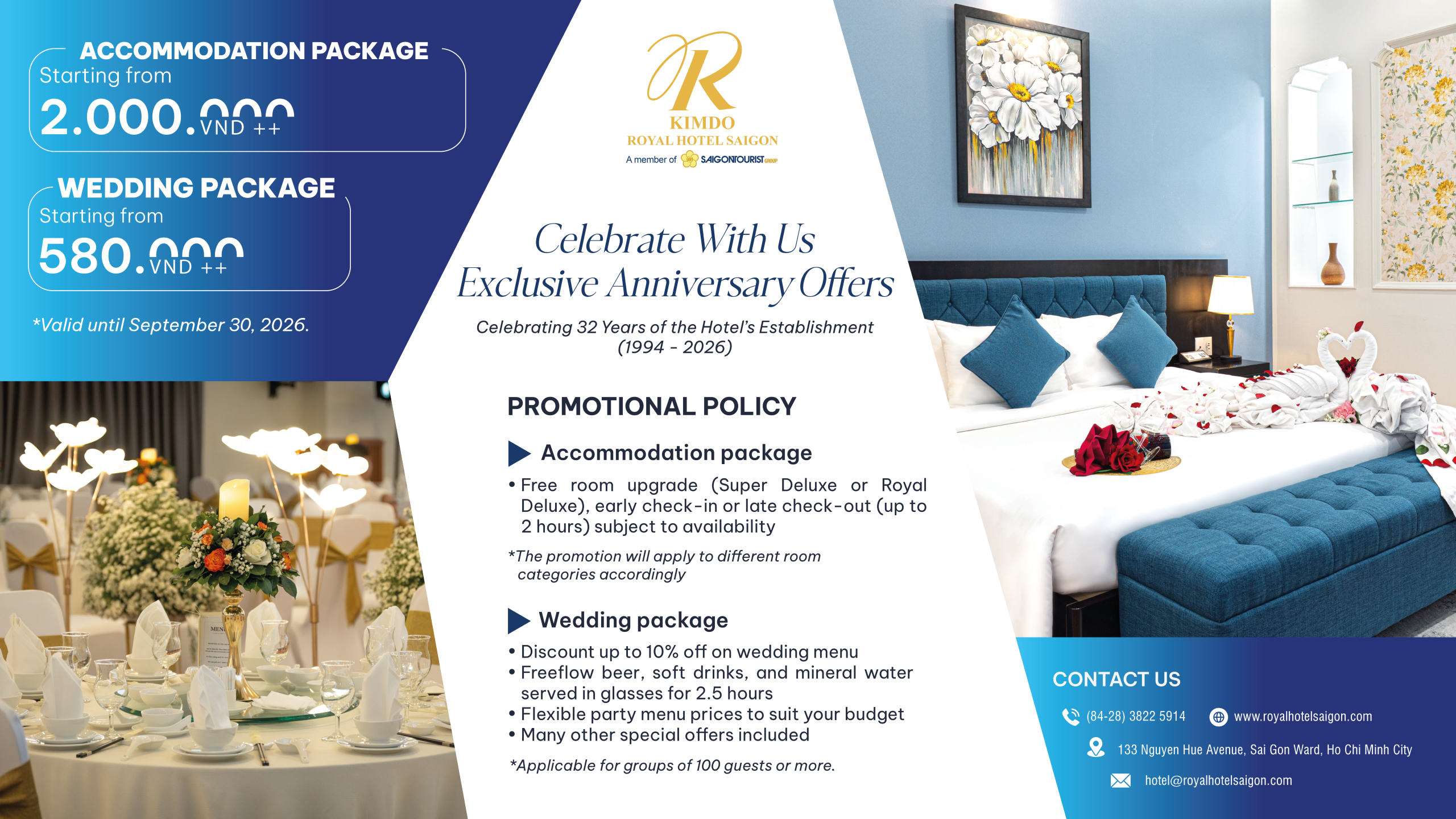 The Kim Do Hotel – Royal Hotel Saigon, affiliated with Saigon Tourism Corporation (Saigontourist Group), is a four-star hotel that offers 127 bedrooms, with 7 different room categories that range from luxurious to mid-range. Each room is standardized according to the hotel’s regulations, with all the necessary amenities and modern electronic devices. The hotel offers 4 conference rooms and 2 meeting rooms that are equipped with state-of-the-art and modern facilities. Due to its central location, it is just a few minutes away from famous landmarks, shopping centers, and government offices. Additionally, Kim Do – Royal Hotel Saigon is approximately 7 km away from Tan Son Nhat International Airport and can be reached within 30 minutes by car.